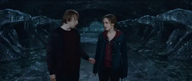 Рон Уизли проходит одну из заметнейших трансформаций от неуверенности к зрелой мужской солидарности. Его прежние комплексы и страхи предательства проявляются в уходе из команды, но возвращение и участие в финальной битве демонстрируют преодоление личных слабостей. В фильме Рон становится символом прощения и восстановления доверия: его отношения с Гермионой и поддержка Гарри показывают, что истинная смелость часто выражается в готовности признать ошибки и вернуться ради общего блага. Этот сюжетный поворот усиливает идею, что личный рост требует не только героических поступков, но и честности перед собой.