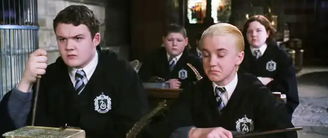 Драко Малфой в фильме продолжает роль антагониста среди сверстников, но его влияние на ход сюжета остаётся ограниченным. Он олицетворяет классическое детское высокомерие и страх перед потерей привилегий в условиях возникновения кризиса. Его поведение усиливает тему предрассудков и класса, показывая, как страх перед неизвестным легко превращается в агрессию и поиски виноватых.